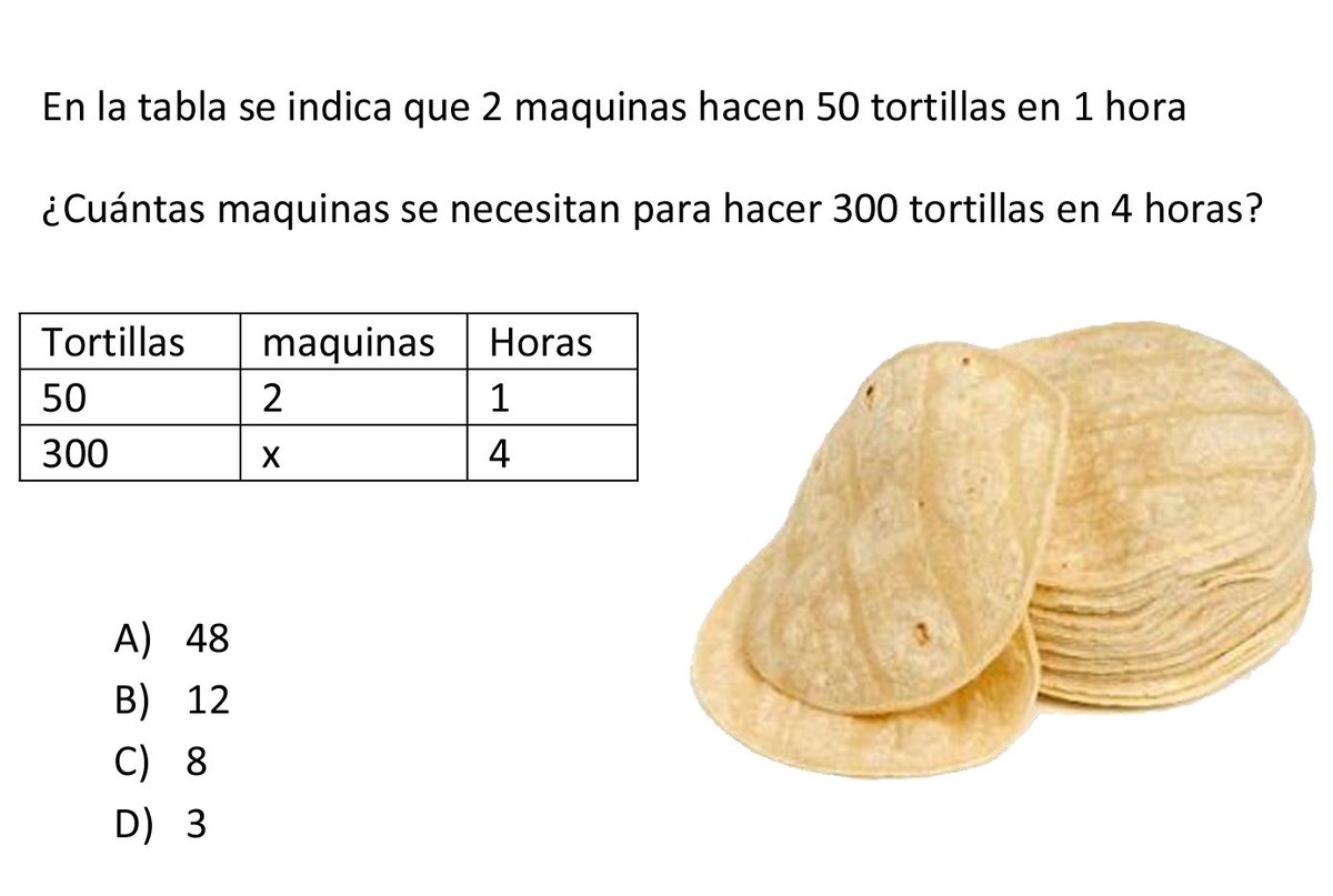 En la tabla se indica que 2 mquinas hacen 50 tortillas en 1 hora cuntas mquinas se necesitan para hacer 300 tortillas en 4 horas. Cuantas trituradoras en_En la tabla se indica que 2 mquinas hacen 50 tortillas en Apr 23 2018 En la tabla se indica que 2 mquinas hacen 50 tortillas en 1 hora cuntas mquinas se necesitan para hacer 3 Recibe ahora mismo las respuest. A 48 B 12 C 8 D 3.